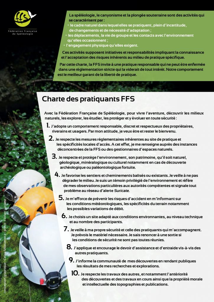 La spéléologie suppose initiative et responsabilité impliquant la connaissance et l’acceptation des risques inhérents au monde souterrain. Sa pratique ne peut être enfermée dans une réglementation stricte qui la viderait de tout intérêt.